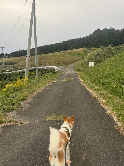 不安定な天気の合間、時雨の止んでいる時、午後4時から50分の散歩。まだ蒸し暑さが残る。 ゴンのお陰で毎日二人が強制的に歩かされるのは、きっと体に善いことなのだろう・・・そう考える。